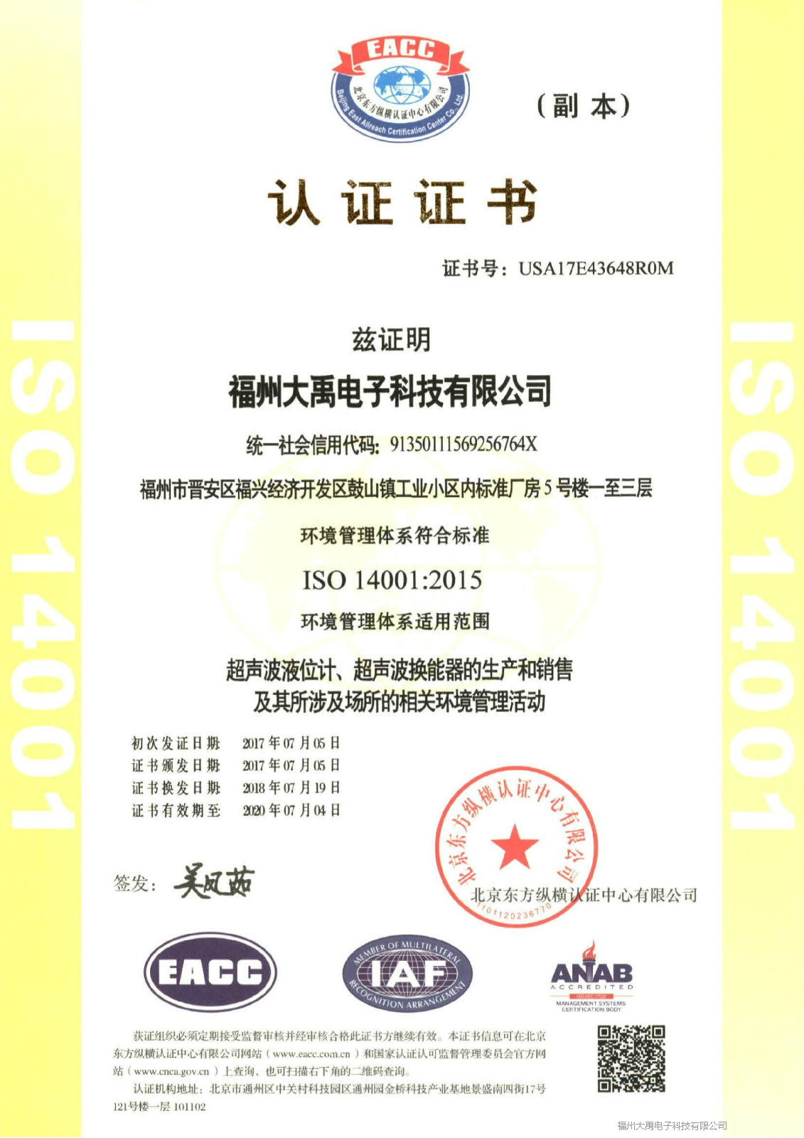 2018年7月,福州大禹電子科技有限公司再次通過了 ISO09001:2015質(zhì)量管理體系認(rèn)證和ISO14001:2015環(huán)境管理體系認(rèn)證,這兩項(xiàng)認(rèn)證標(biāo)志著福州大禹電子科技有限公司的競(jìng)爭(zhēng)力又上了一個(gè)新的臺(tái)階。